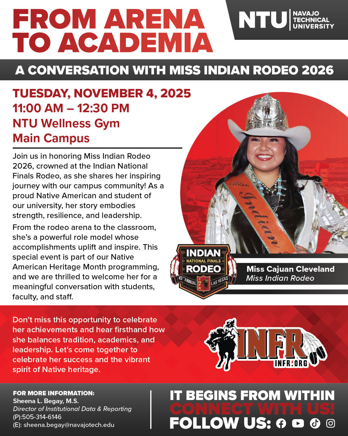 Join us on November 4, 2025, from 11 AM to 12:30 PM inside the NTU Wellness Gym to honor Miss Indian Rodeo 2026, crowned at the Indian National Finals Rodeo, as she shares her inspiring journey with our campus community.
