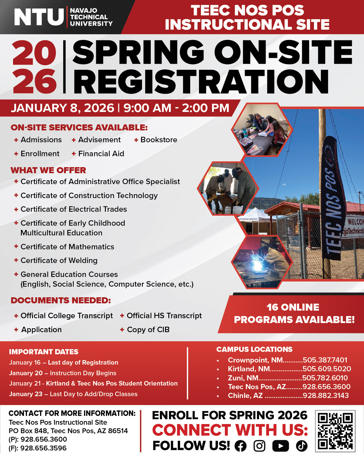 Teec Nos Pos currently offers courses to students in the Four Corners region in northeastern Arizona. The site facilities are located south of the Teec Nos Pos Chapter compound, Highway 160 BIE Road N5114. Contact the Teec Nos Pos Coordinator at 928.656.3600